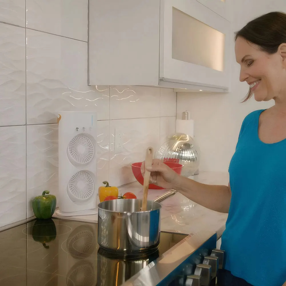 1. Dual-Head Design for Optimal Cooling: This spray air conditioner fan features a dual-head design, providing wider and more even air distribution for optimal cooling effect.